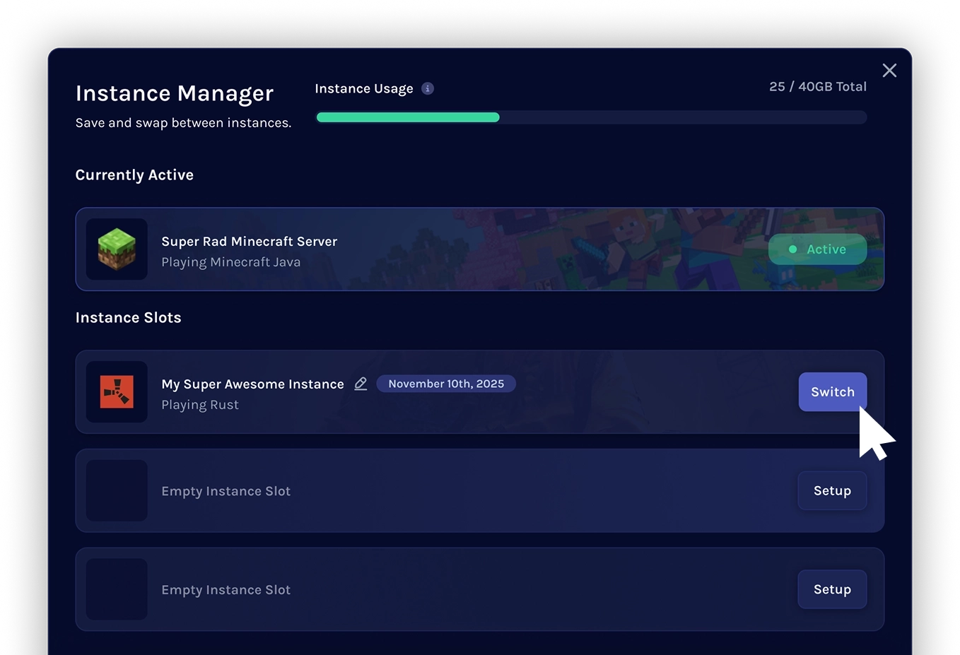 Thanks to our instance manager, you can freely switch between 100+ different games without the hassle of fully customizing your mods and settings or losing your progress every time you switch. This tool allows you to save instances of different games and configurations that you can swap between with just a single click!