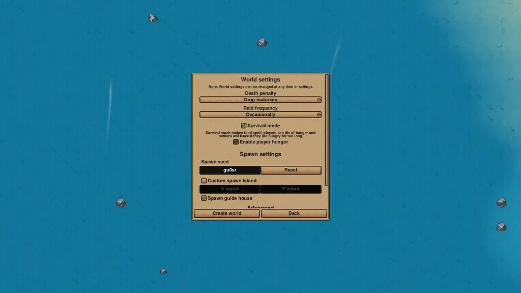 - Toggle Survival Mode: When turned on, food spoils, players die of hunger, and settlers leave if they’re hungry for too long.