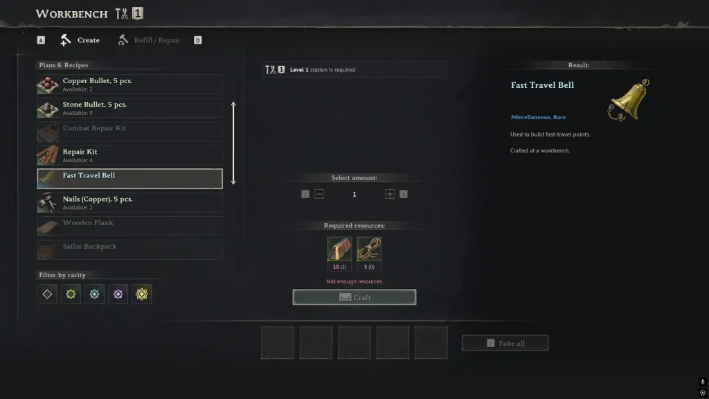 Once you've unlocked the Fast Travel Bell schematic, crafting it is very simple. In fact, it can be done right from your basic Level 1 Workbench!