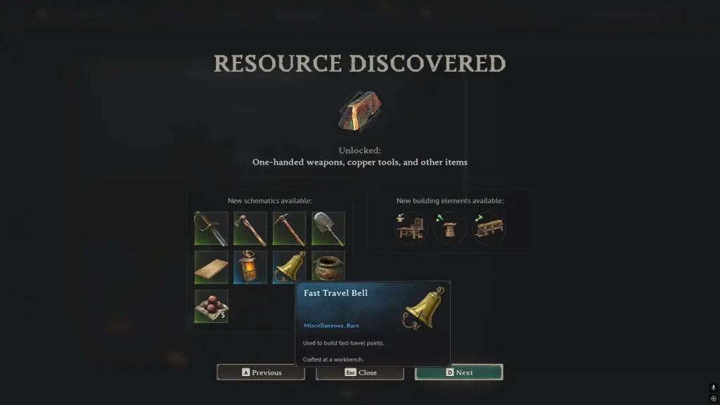 Despite its Rare status, the bell can be unlocked in two different ways right from the starting island. The first method simply takes mining Copper Ore, getting charcoal from the Charcoal Kiln (by heating wood), and then smithing the Copper Ingots in the Smelting Furnace. Once you discover your first Copper Ingot, you'll unlock the Fast Travel Bell schematic.